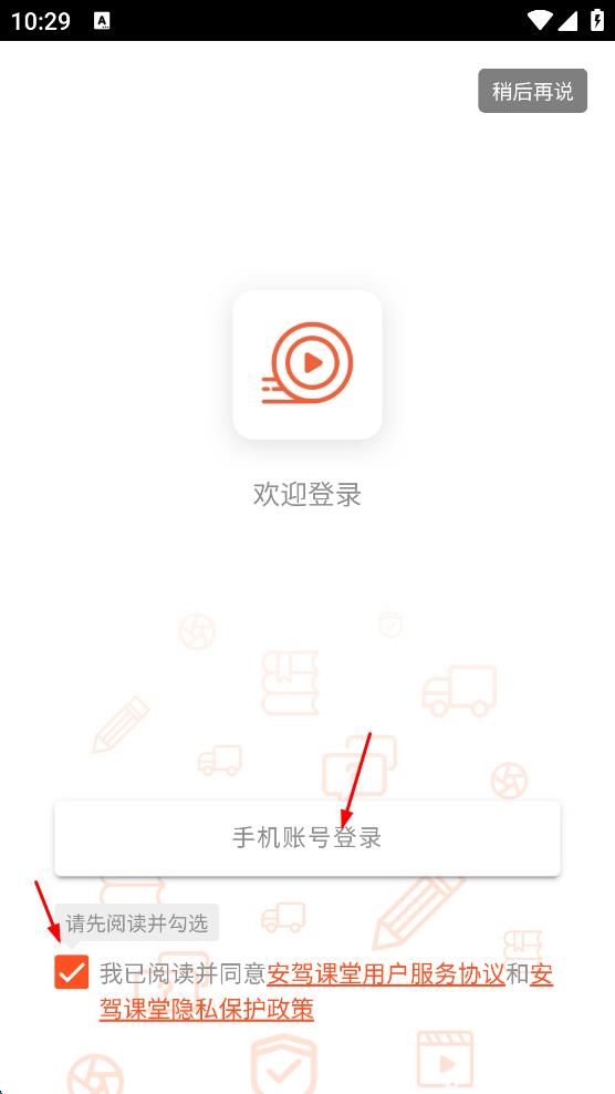 2、進(jìn)入登錄頁(yè)面,勾選“我已閱讀并同意安駕課堂用戶服務(wù)協(xié)議和安駕課堂隱私保護(hù)政策”,點(diǎn)擊“手機(jī)賬號(hào)登錄”按鈕。
