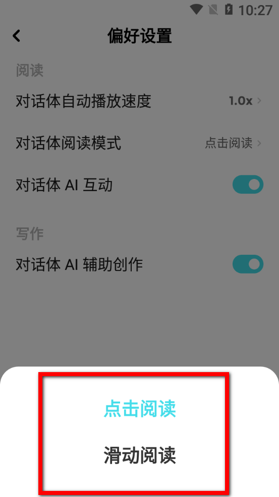 3、在偏好設(shè)置頁面,點擊對話體閱讀模式選項,彈出閱讀模式選擇框。