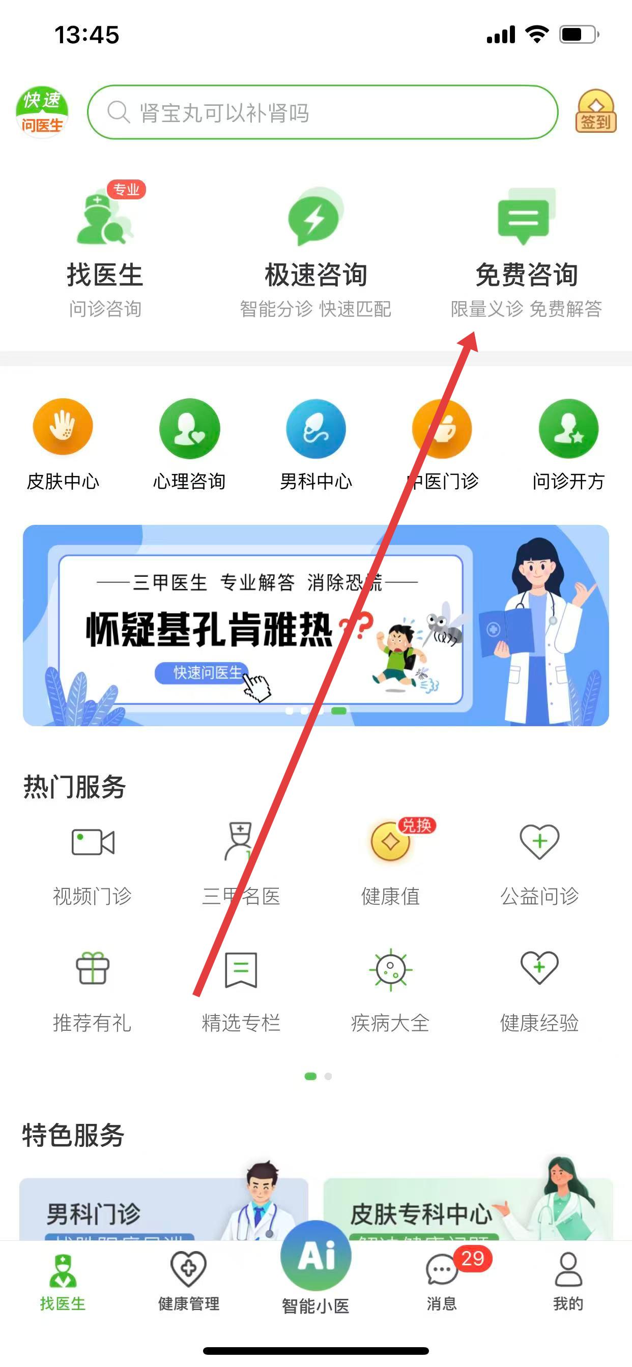 1、打開快速問醫(yī)生APP首頁,點擊免費咨詢選項。