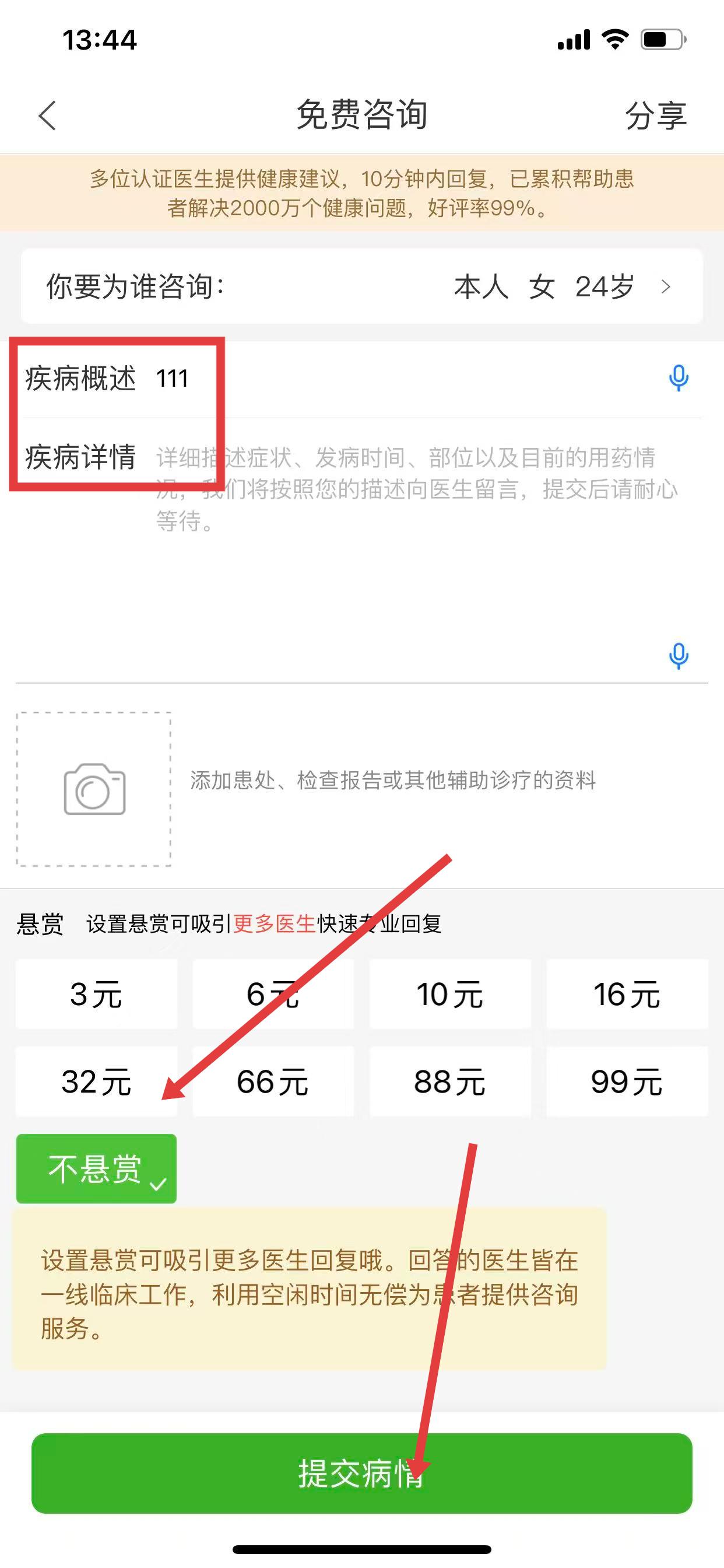 2、在免費咨詢頁,填寫疾病概述、疾病詳情,選擇不懸賞。