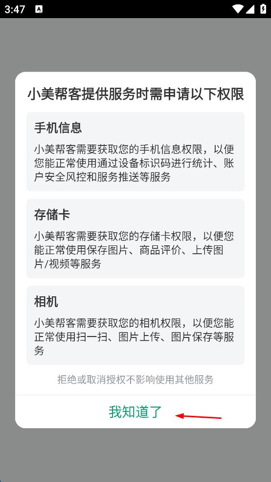 1、打開小美幫客App,出現(xiàn)權(quán)限申請彈窗,閱讀后點擊我知道了按鈕。