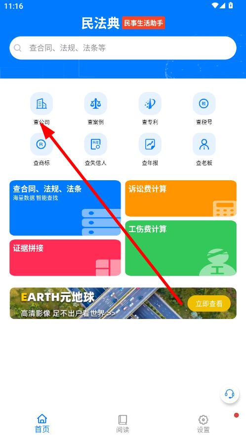 1、打開民法典民事生活助手進(jìn)入首頁,點擊查公司選項。
