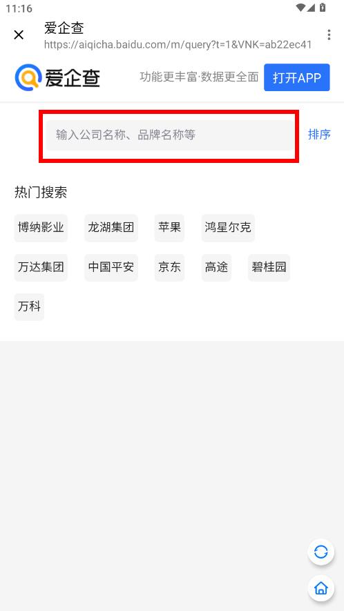 2、進(jìn)入愛企查頁面后,在輸入框中輸入公司名稱或品牌名稱等信息。