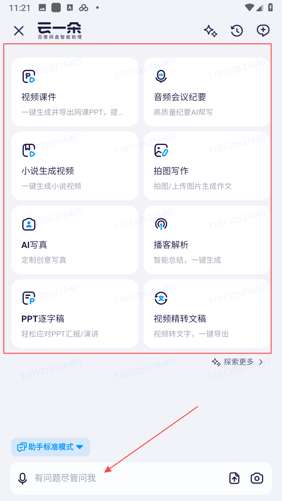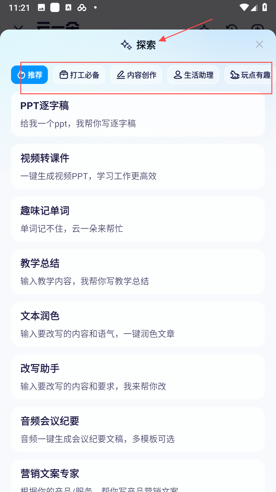 2、若已展示功能中沒有所需的,點(diǎn)擊頁面中的探索更多選項(xiàng),進(jìn)入探索界面,這里按照推薦,打工必備,內(nèi)容創(chuàng)作,生活助理,玩點(diǎn)有趣”等類別,展示了更多的AI工具和功能。