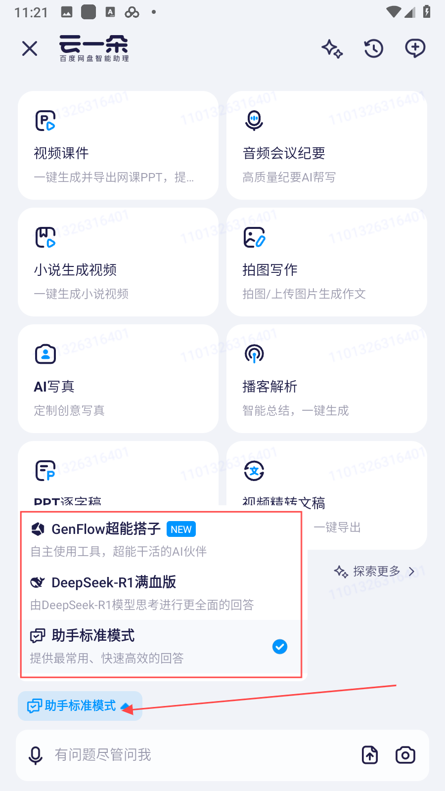 3、在云一朵界面左下角,點(diǎn)擊助手標(biāo)準(zhǔn)模式下拉框,可在GenFlow超能搭子,DeepSeek-R1滿血版,助手標(biāo)準(zhǔn)模式等模式間切換,不同模式有不同特性。