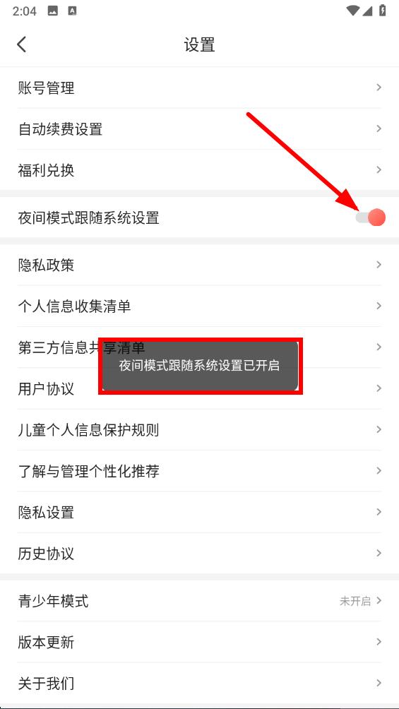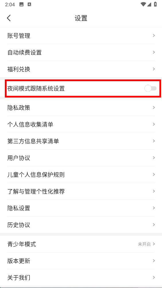 3、在設(shè)置界面里找到夜間模式跟隨系統(tǒng)設(shè)置選項(xiàng),此時該選項(xiàng)按鈕呈關(guān)閉狀態(tài)。