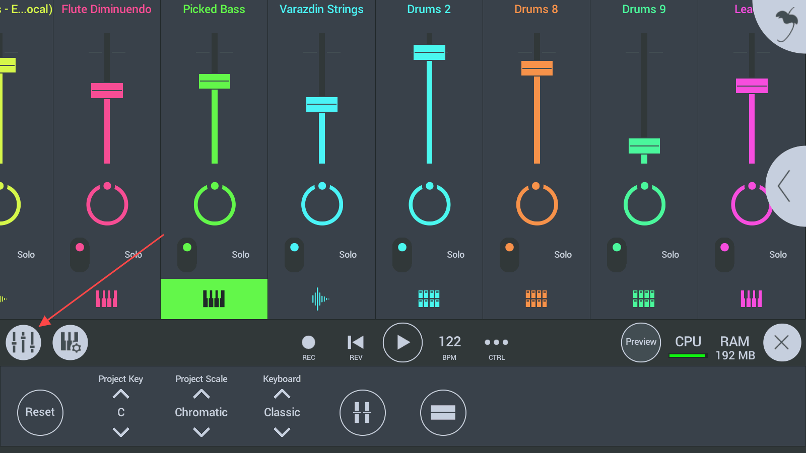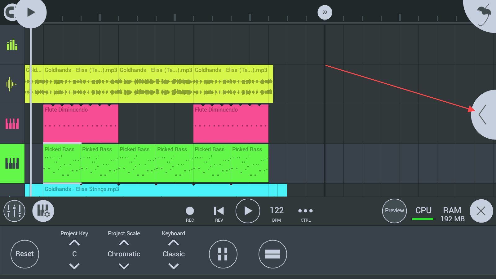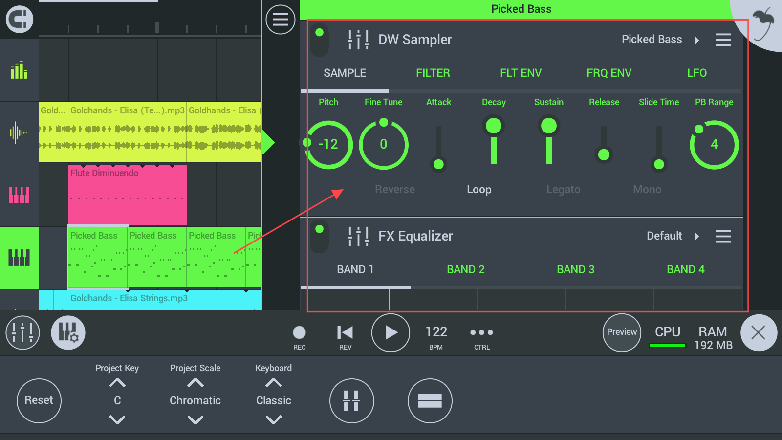 1、打開FL Studio Mobile軟件進(jìn)入音頻編輯界面,點(diǎn)擊界面右側(cè)的箭頭圖標(biāo),展開音頻編輯的詳細(xì)參數(shù)設(shè)置區(qū)域,可看到DW Sampler、FX Equalizer等模塊,方便對(duì)音頻進(jìn)行細(xì)致調(diào)整。