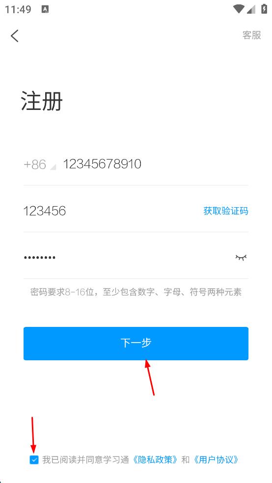 4、勾選我已閱讀并同意學(xué)習(xí)通隱私政策和用戶協(xié)議,然后點擊下一步按鈕。