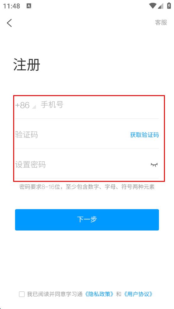 3、在注冊頁面,依次填寫手機號、獲取并填寫驗證碼,再設(shè)置符合要求的密碼。