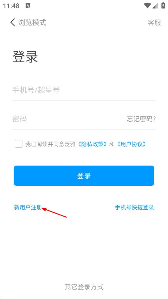 2、進入登錄界面,若沒有賬號,點擊新用戶注冊選項。