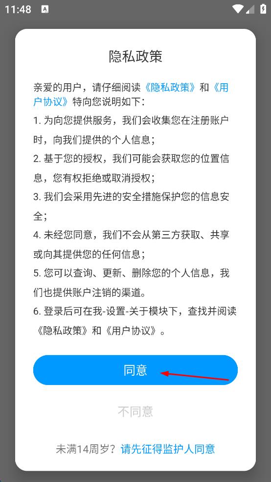 1、打開學(xué)習(xí)通,會彈出隱私政策頁面,仔細(xì)閱讀后點擊同意按鈕。