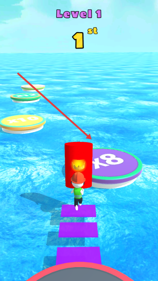 2、沿藍(lán)色跑道前進(jìn),踩彩色圓盤,如x8獲增益,保持領(lǐng)先,避紅色障礙柱,沖向終點。
