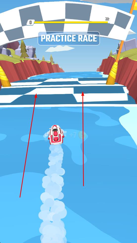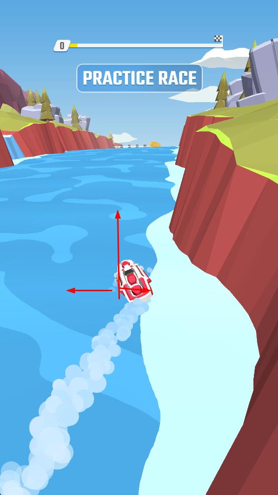 1、操控賽艇沿河道行駛,調(diào)整方向避開兩側(cè)懸崖,保持行進(jìn)路線。