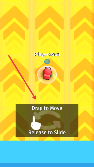 1、點(diǎn)擊PLAY,進(jìn)入黃色賽道場(chǎng)景,操控紅帽子角色Player4563,按Drag to Move滑動(dòng)屏幕移動(dòng),Release to Slide觸發(fā)滑行。