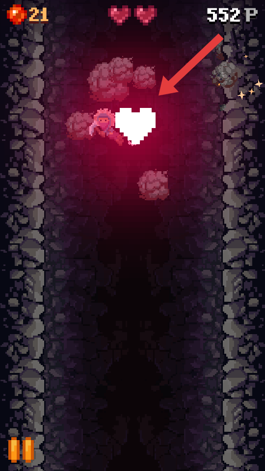 3、見紅心的道具立即點(diǎn)擊拾取回血,利用場(chǎng)景元素巖石臺(tái)接力跳,持續(xù)深入洞穴,積累資源的升級(jí)。
