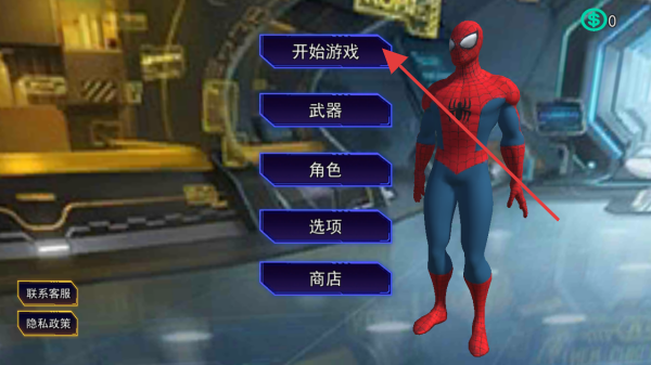 1、進入游戲主界面,點擊開始游戲,操控蜘蛛俠角色,開啟城市冒險,可先在武器、角色界面配置戰(zhàn)力。