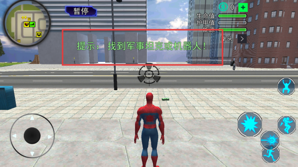 2、在城市場景,按提示找到軍事坦克或機器人,利用小地圖與移動搖桿,在街道、建筑間探索,尋找目標。