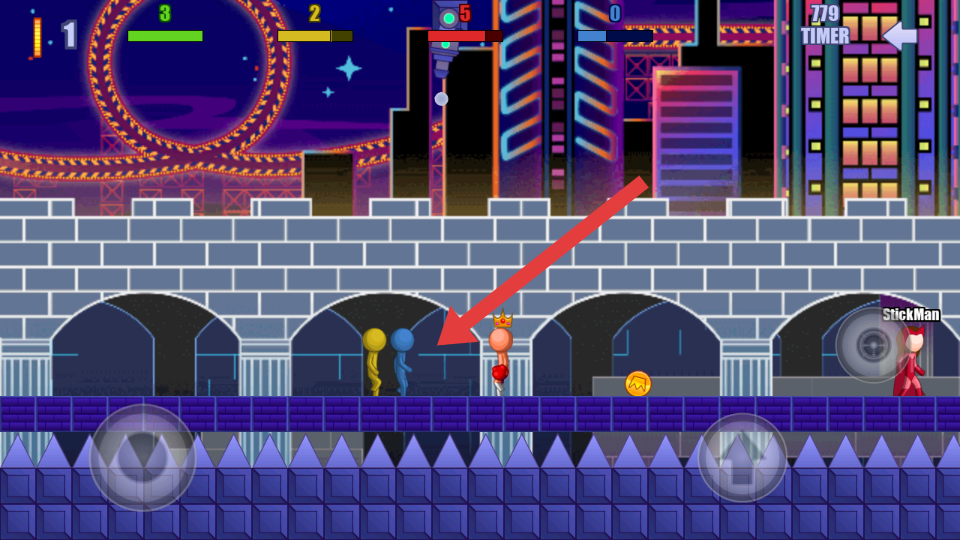 1、進入關(guān)卡,操控對應(yīng)顏色火柴人如紅色箭頭指向角色,利用左側(cè)方向鍵移動,跨越磚墻、尖刺等障礙。