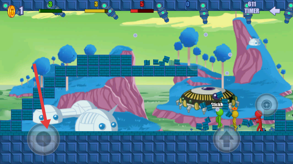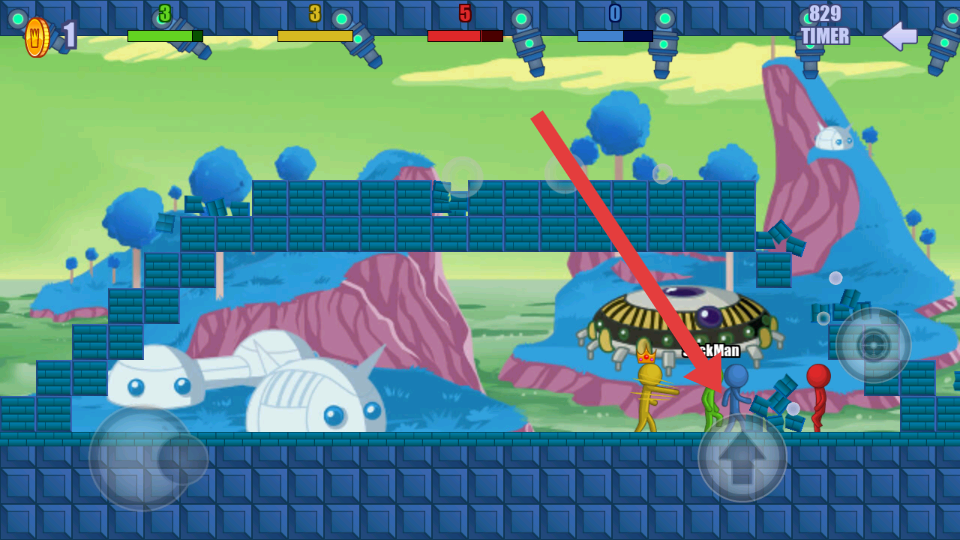3、在有白色機械、飛碟障礙區(qū)域,分工協(xié)作,紅色火柴人吸引火力,藍色或者綠色負責破壞相關(guān)障礙。