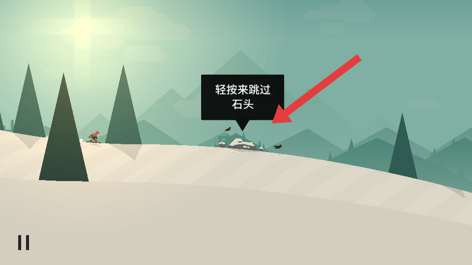 1、進(jìn)入游戲,角色自動滑行,遇到石頭障礙,按提示輕按屏幕跳躍,避開石頭,繼續(xù)前進(jìn)。