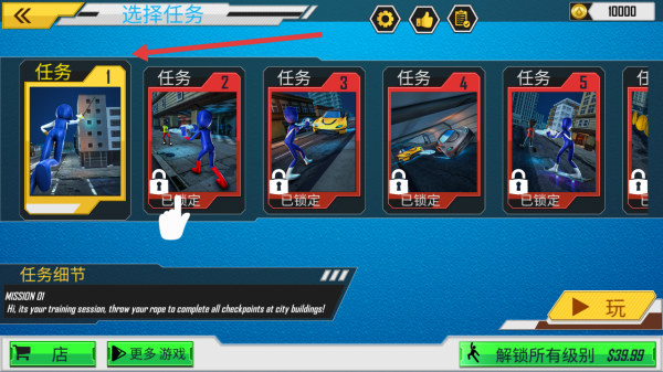 1、在選擇任務(wù)界面,選解鎖的任務(wù)1卡片,點(diǎn)擊右下角玩,進(jìn)入城市場景開啟任務(wù)。