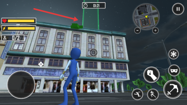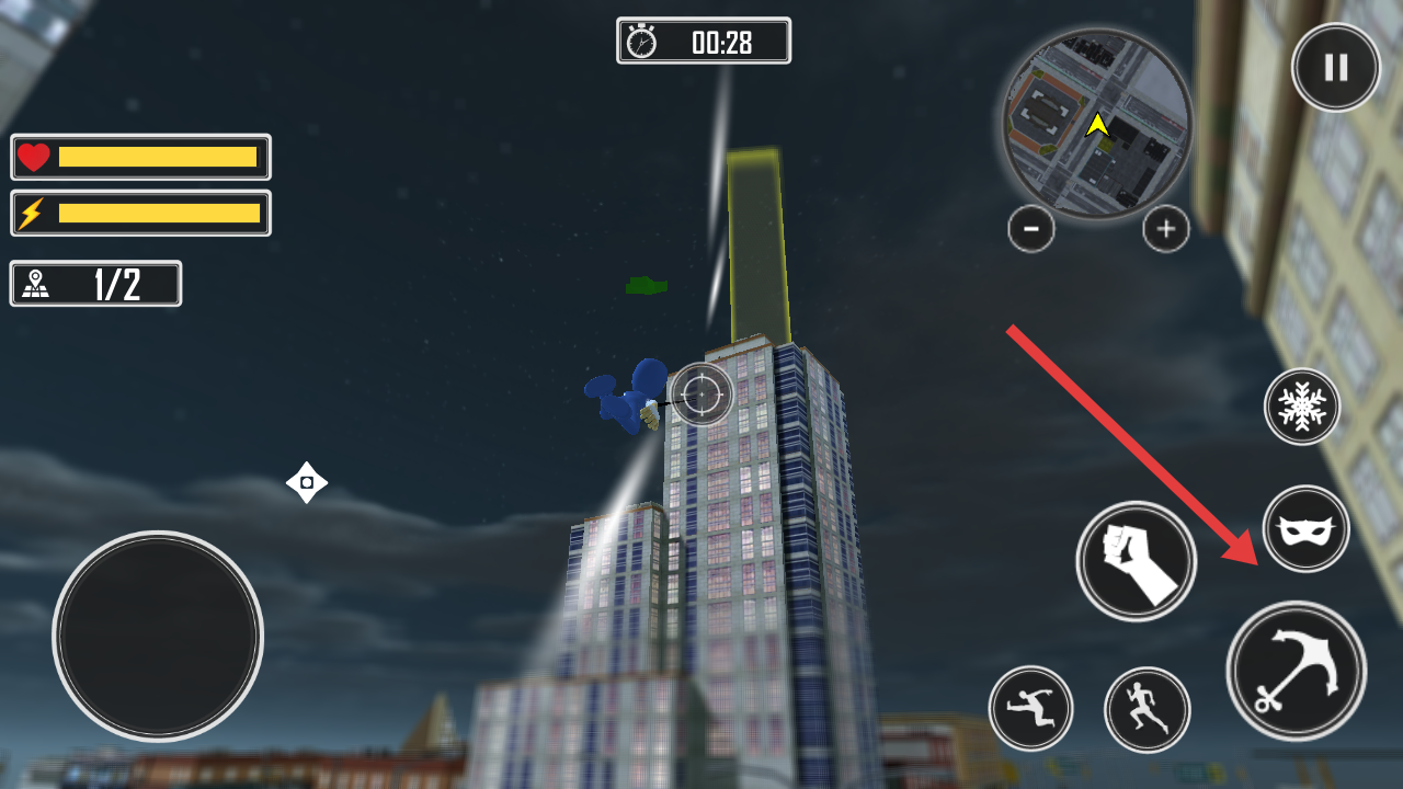 2、按小地圖指引,朝目標(biāo)建筑移動,遇障礙時,點(diǎn)擊右側(cè)鉤鎖按鈕錨狀圖標(biāo),發(fā)射鉤鎖攀爬建筑。