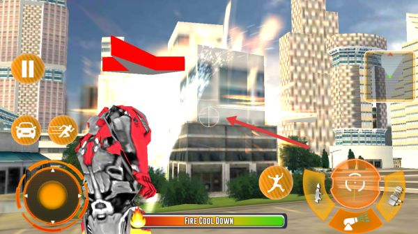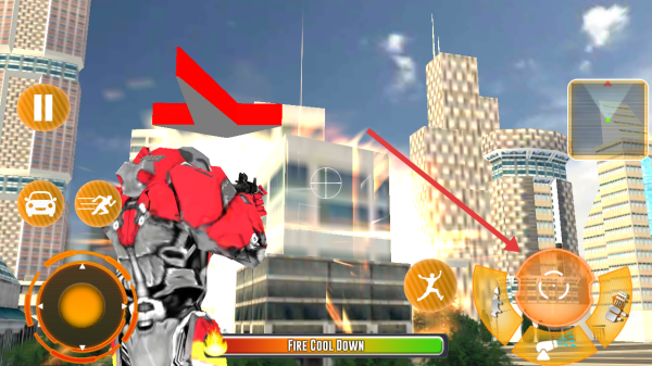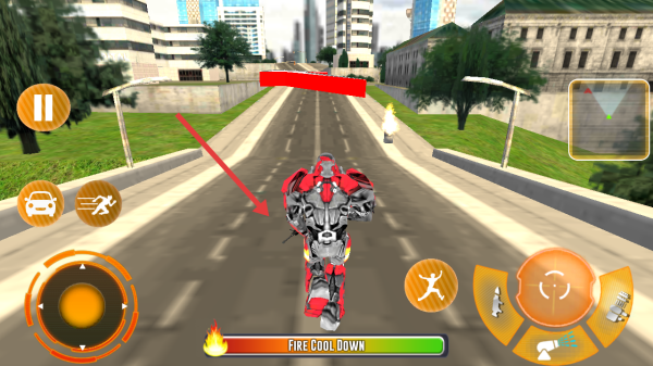 1、操控紅銀機器人在城市道路奔跑,按左側(cè)搖桿調(diào)整方向,借助FIRE COOL DOWN進度條,前往火災建筑。