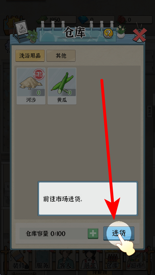1、當(dāng)客人有沙浴需求且缺少河沙時(shí),要前往市場(chǎng)進(jìn)貨,進(jìn)入倉(cāng)庫(kù)界面,能看到洗浴用品等分類(lèi),點(diǎn)擊進(jìn)貨按鈕,就能補(bǔ)充河沙等物品,滿足客人沙浴需求。