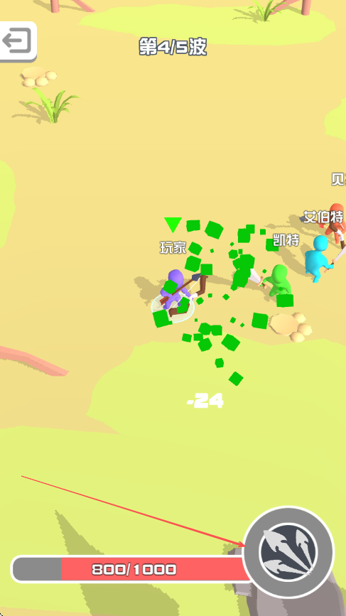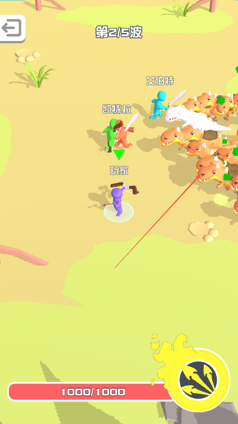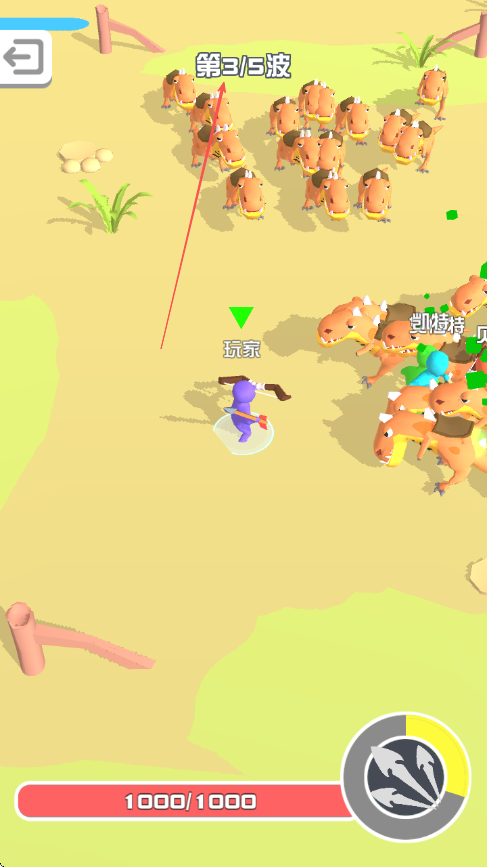 2、畫面顯示當(dāng)前波數(shù),如第3/5波,下方紅色血條顯示玩家生命值1000/1000。