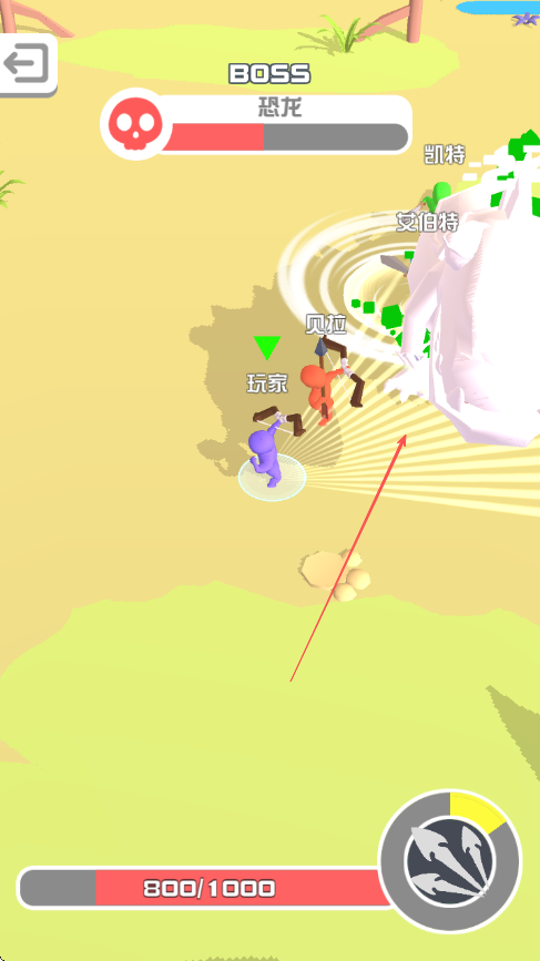 4、遇到BOSS關(guān)卡,屏幕上方顯示“BOSS”及BOSS名稱如恐龍,和隊(duì)友配合擊敗BOSS,完成關(guān)卡。