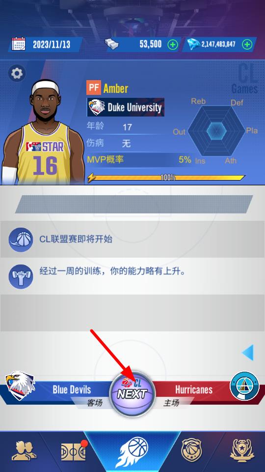 1、點(diǎn)擊NEXT按鍵,可推進(jìn)游戲進(jìn)程,進(jìn)入下一場CL聯(lián)盟賽,參與的賽事獲取獎(jiǎng)勵(lì)與經(jīng)驗(yàn)。