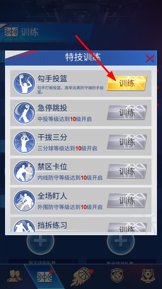 2、在特技訓(xùn)練界面,點(diǎn)擊訓(xùn)練按鍵可進(jìn)行勾手投籃訓(xùn)練,提升技能水平,增強(qiáng)得分的能力。