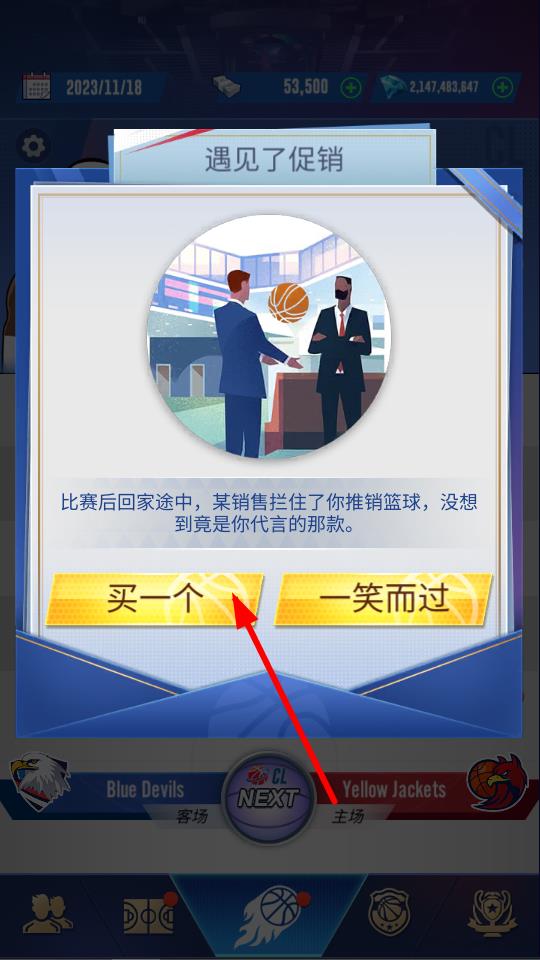 3、遇到促銷事件時(shí),點(diǎn)擊買一個(gè)可獲取代言的籃球道具,助力球員訓(xùn)練或比賽,提升體驗(yàn)。