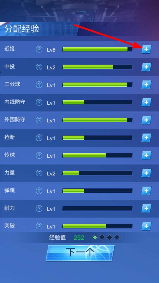 4、在分配經(jīng)驗(yàn)界面,點(diǎn)擊近投右側(cè)的+按鍵,可將經(jīng)驗(yàn)分配給近投屬性,提升球員近投能力。
