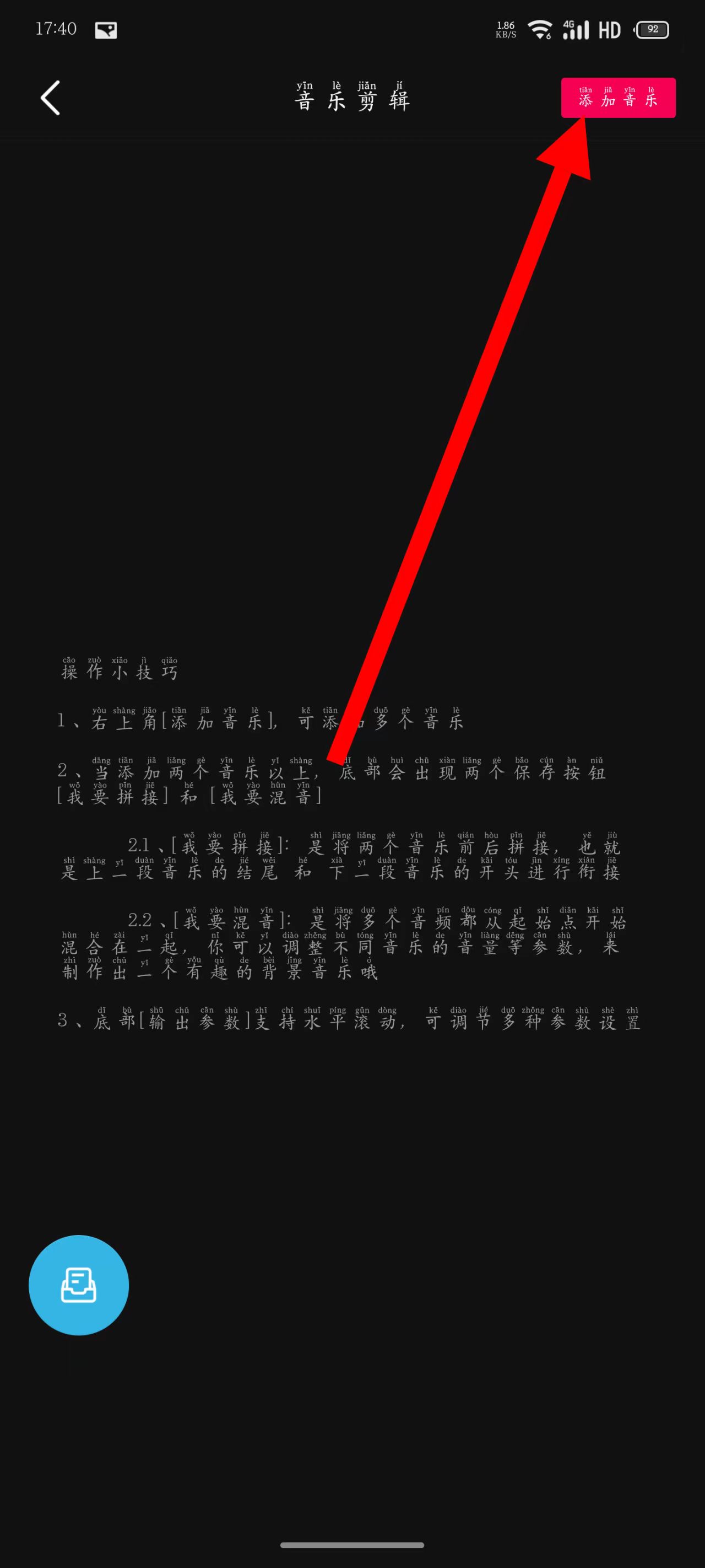 2、進(jìn)入音樂剪輯頁面后,點擊右上角添加音樂。