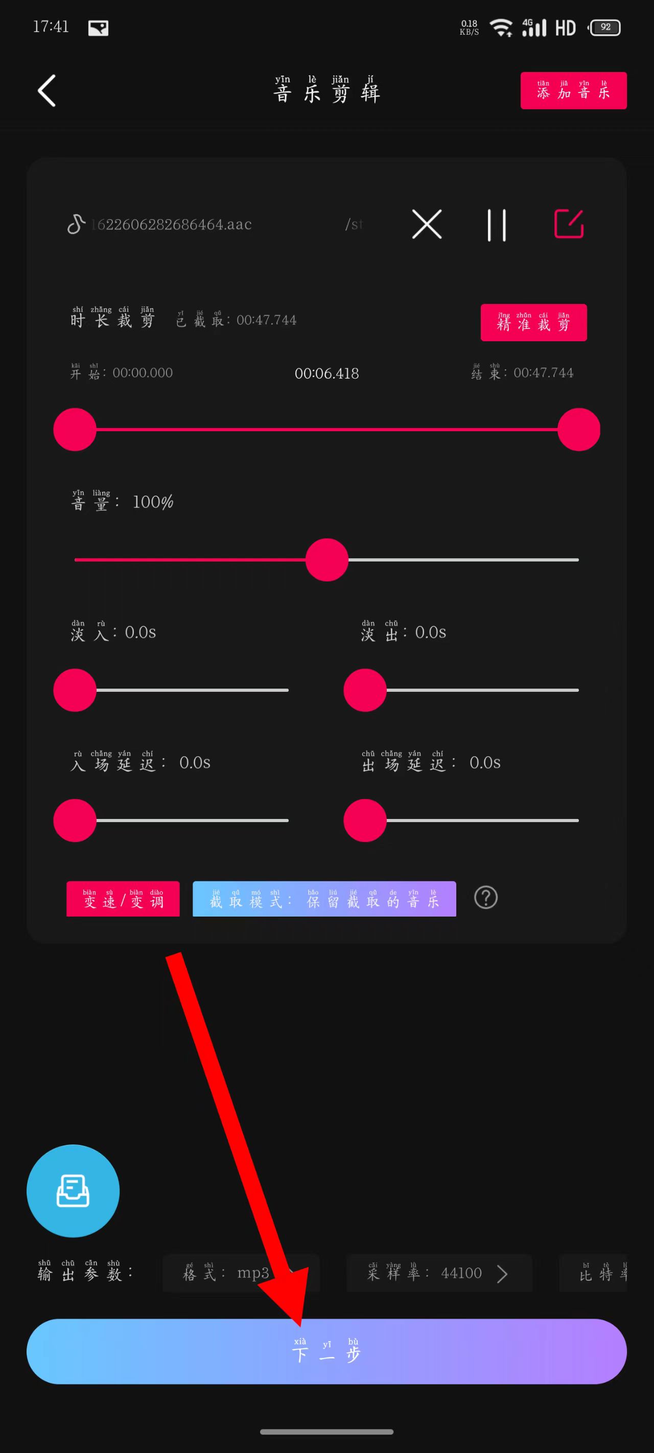 4、對音樂時長、音量、淡入淡出等參數(shù)進(jìn)行調(diào)整,調(diào)整完成后點擊下一步。