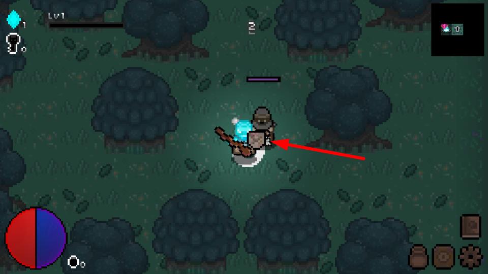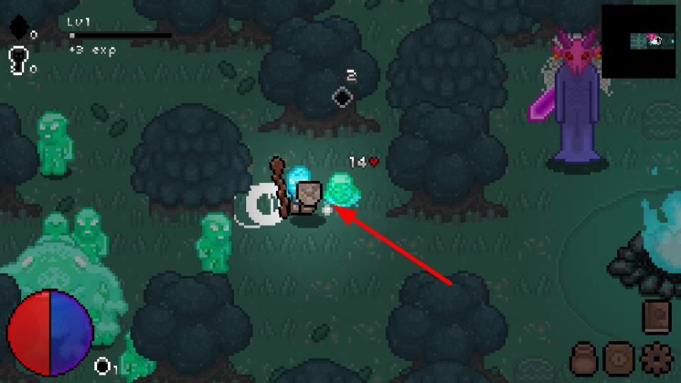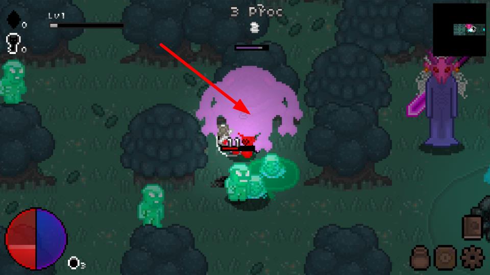4、操控角色攻擊箭頭指向的紫色怪物,可對其造成傷害,擊敗怪物后能獲取經(jīng)驗和道具,提升角色實力。