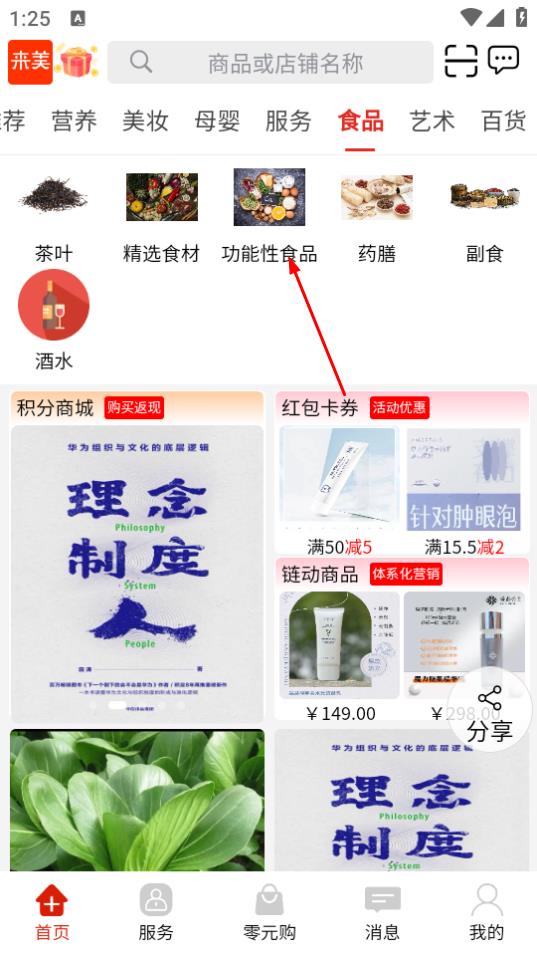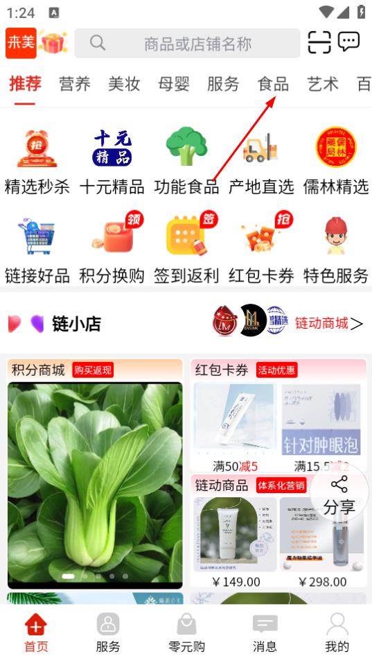 1、打開來美商城,在首頁點(diǎn)擊食品分類標(biāo)簽。