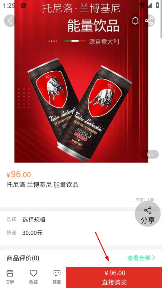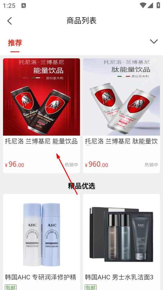 3、在商品列表中,點(diǎn)擊想要查看的商品,如托尼洛蘭博基尼能量飲品。