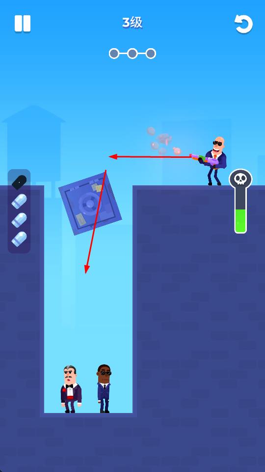 2、場景元素巧妙利用:關(guān)卡中常包含墻壁、障礙物等可利用元素,玩家需借助物體反彈改變子彈軌跡,巧妙繞開障礙命中隱蔽敵人,元素的靈活運用讓解謎過程更具深度。