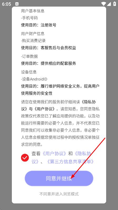 1、在隱私協(xié)議彈窗中,點(diǎn)擊同意并繼續(xù),進(jìn)入小悟故事主頁面。
