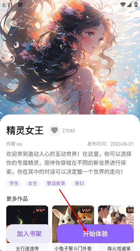 3、在精靈女王作品詳情頁面,點(diǎn)擊開始體驗,進(jìn)入互動故事頁面。
