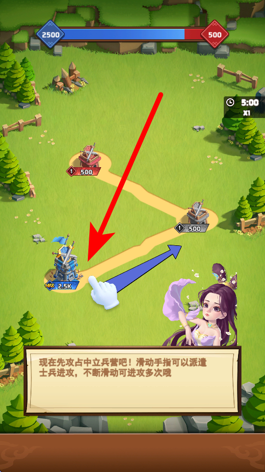 1、開局先攻占中立兵營,滑動(dòng)手指能派遣士兵進(jìn)攻,不斷滑動(dòng)可多次進(jìn)攻,以此積累己方兵力,擴(kuò)大優(yōu)勢(shì)。