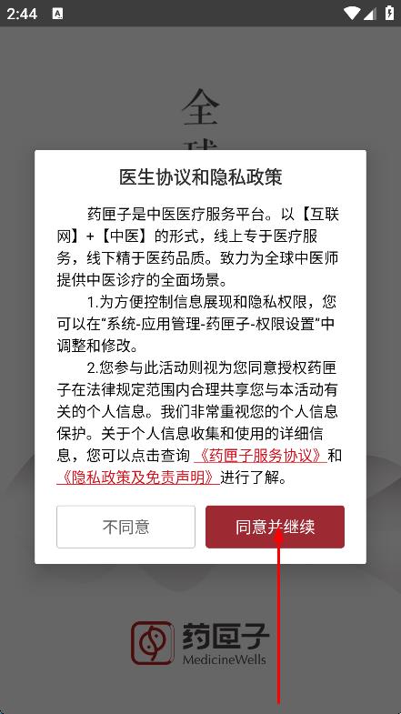 1、在隱私政策彈窗中,點擊同意并繼續(xù),進入APP主頁面。