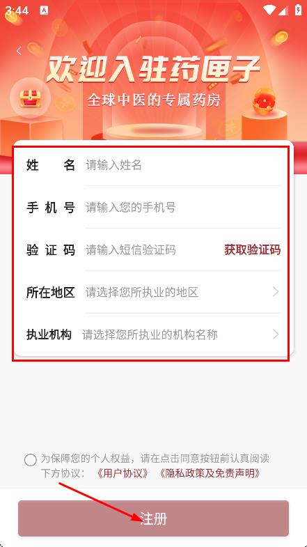4、填寫姓名、手機號等信息,獲取并輸入驗證碼,點擊注冊,完成注冊操作。
