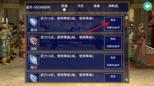 1、在商店界面中,點擊購買按鈕可獲取武器,如直劍能提升1點武力,根據(jù)戰(zhàn)斗需求選擇合適武器。