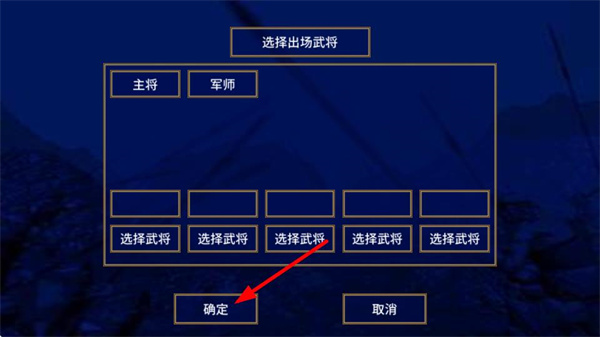 3、在選擇出場武將界面,選定主將、軍師及其他武將后,點擊確定按鈕即可確認陣容,開啟戰(zhàn)役。