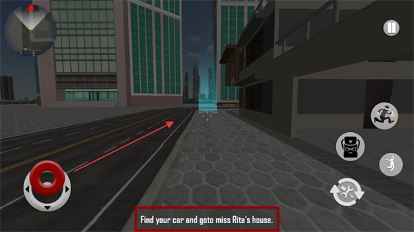 1、進(jìn)入游戲查看下方提示Find your car and goto miss Rita's house,通過(guò)左邊虛擬搖桿控制角色移動(dòng)找車(chē)。