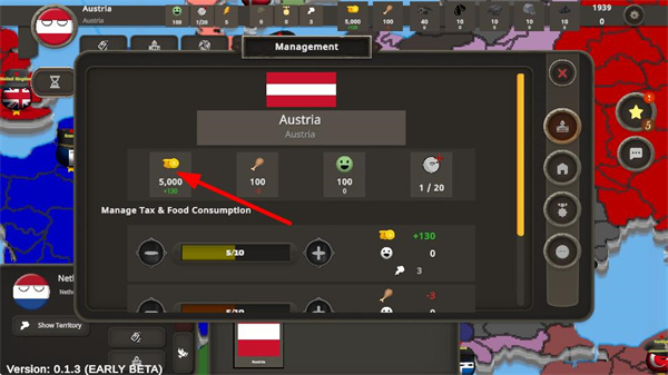 3、在管理界面中,關(guān)注金幣等資源數(shù)值,通過調(diào)整稅收和食物消耗等管理選項,保障國家經(jīng)濟穩(wěn)定。