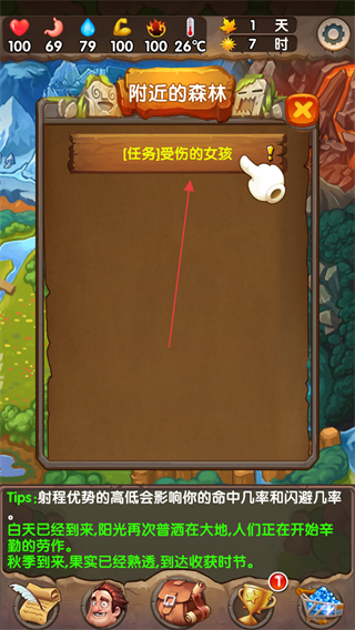 1、打開游戲界面,點擊任務(wù)受傷的女孩,查看任務(wù)列表,了解任務(wù)詳情。